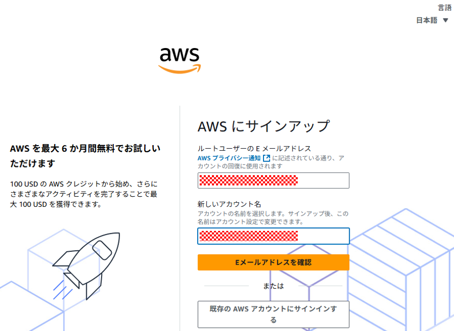 「AWSにサインアップ」のページが表示されますので、「メールアドレス」と「アカウント名」を入力します。