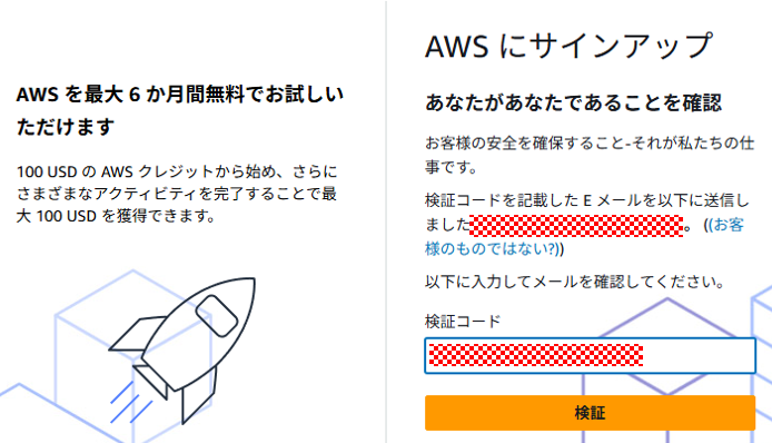 入力したメールアドレスに検証コードが届きますので入力して「