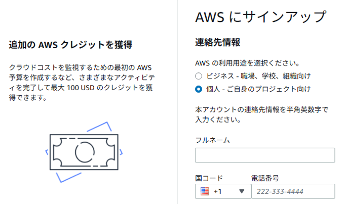 連絡先情報を入力して「AWS カスタマーアグリーメント」に同意したら
