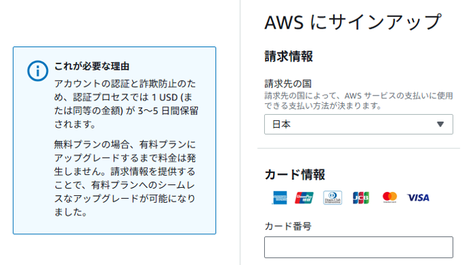 「AWSアカウント」の作成にはクレジットカードが必要になります。AWSは一定の条件を満たせば無料で利用を始めることができますが、無料の機能だけを利用するつもりでもクレジットカードの登録は必要になります。