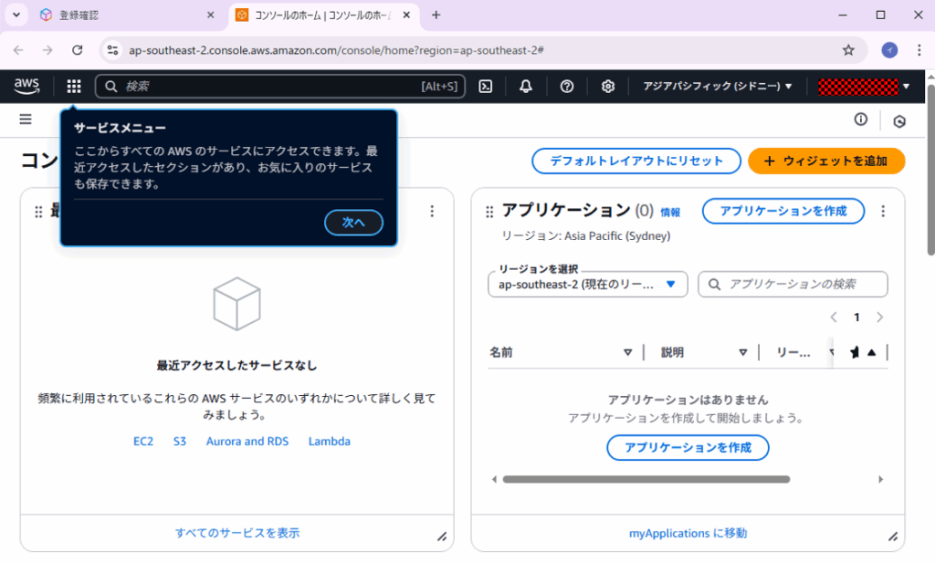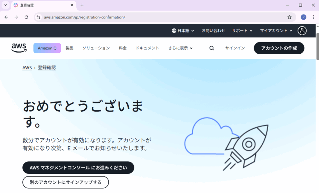 」を押してAWSマネジメントコンソールに接続できれば成功です。